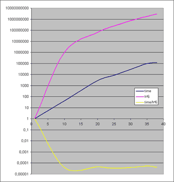 da ganz klar zu erkennen ist das das Verhältnis time/h6 bei anständigen h in etwa gleich bleibt, bestätigt unsere Annahme der Aufwand gehe mit O(h6).